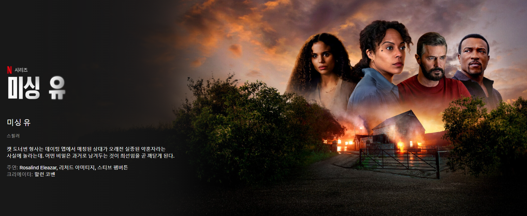 '미싱유'는 할런 코벤의 동명 베스트셀러 소설을 원작으로 한 넷플릭스 오리지널 시리즈입니다. 이 작품은 예기치 않게 온라인에서 옛 연인을 만난 형사 캣 도너번이 어두운 음모에 휘말리게 되는 이야기를 그리고 있습니다.