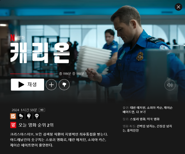 - 다소 뻔한 전개 액션 스릴러 장르의 클리셰를 많이 따르다 보니 예측 가능한 전개가 있어요. 장르에 익숙한 관객들은 약간의 아쉬움을 느낄 수 있겠네요.