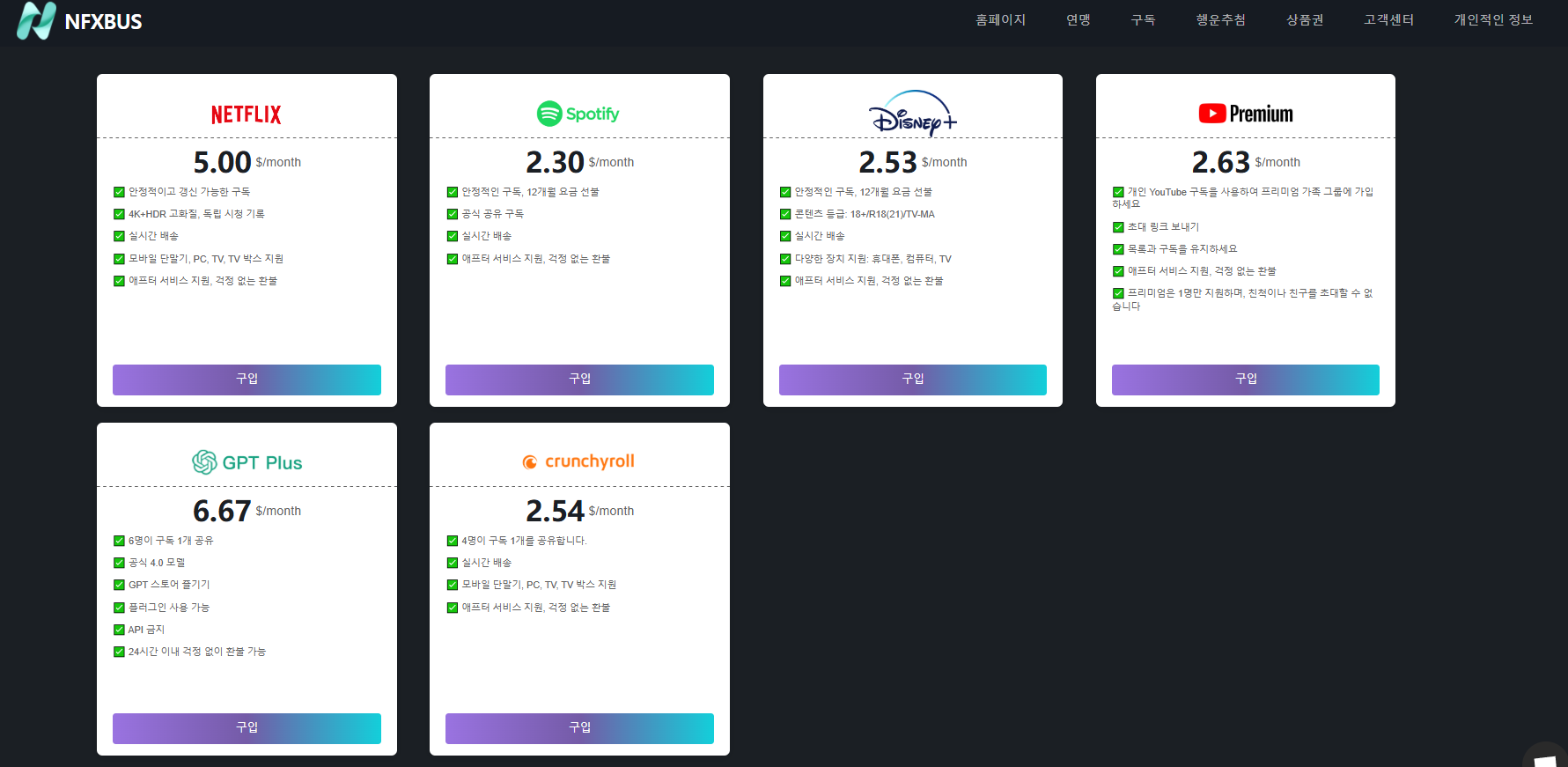 - 다양한 서비스: 넷플릭스뿐만 아니라 유튜브 프리미엄, 디즈니플러스, Spotify 등 다양한 서비스를 제공합니다.
