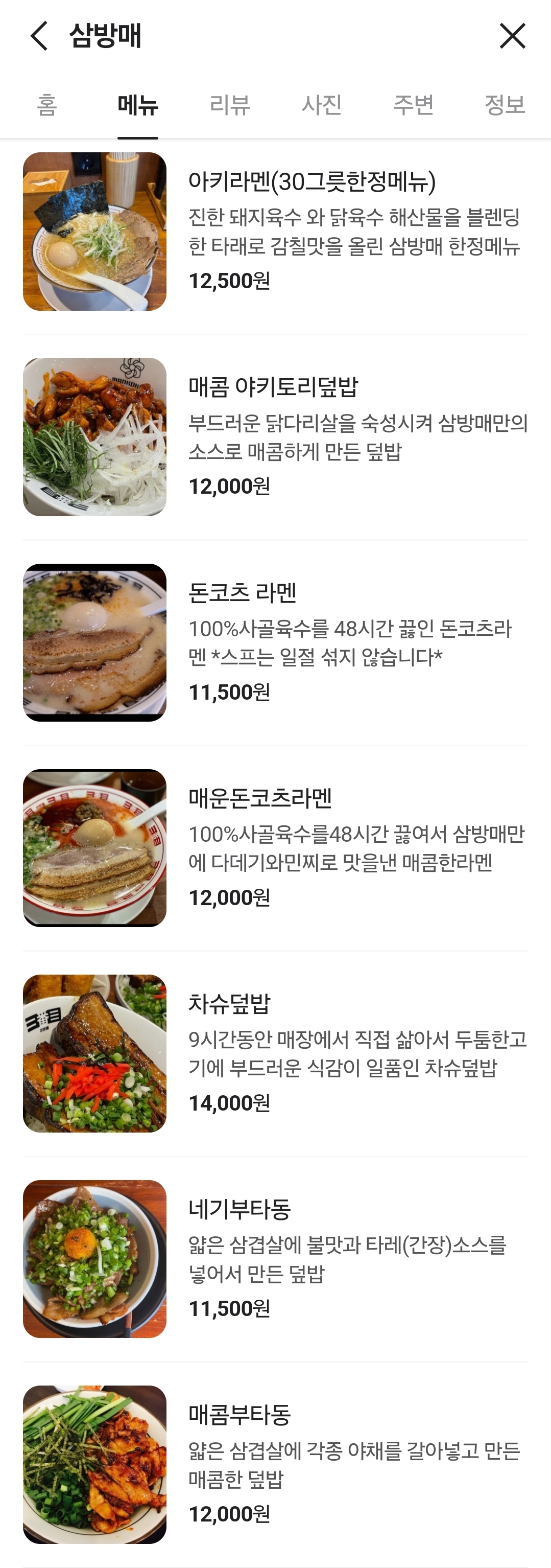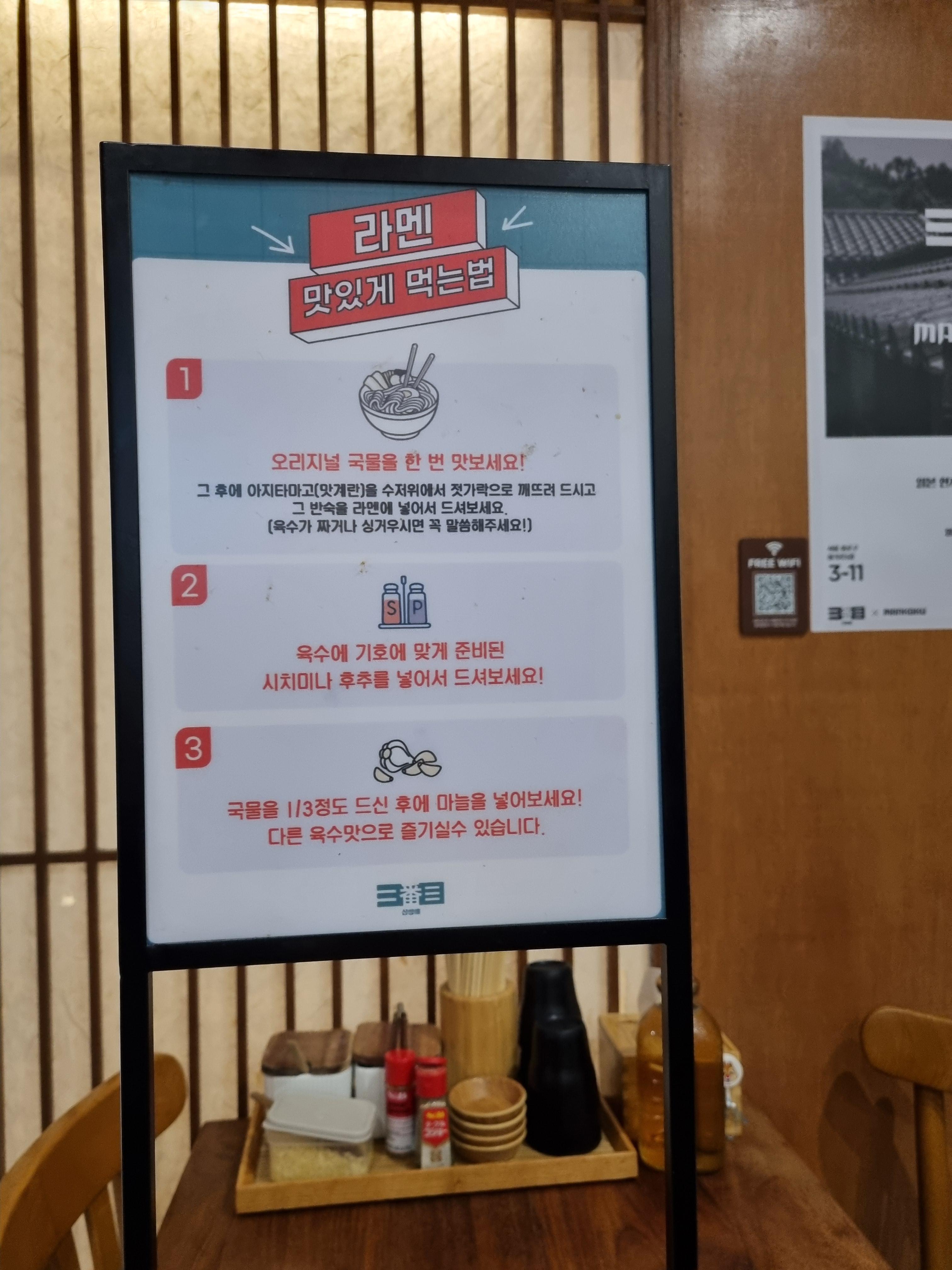 삼방매의 돈코츠 라멘은 국물, 면발, 차슈 모두 훌륭했지만, 차슈의 두께가 얇아서 호불호가 갈릴 것 같습니다! 또, 내부 공간이 좁아 테이블 간 간격이 다소 가까운 점은 불편할 수 있으니 참고하세요!(옆 테이블과 너무 가까워요🥲)