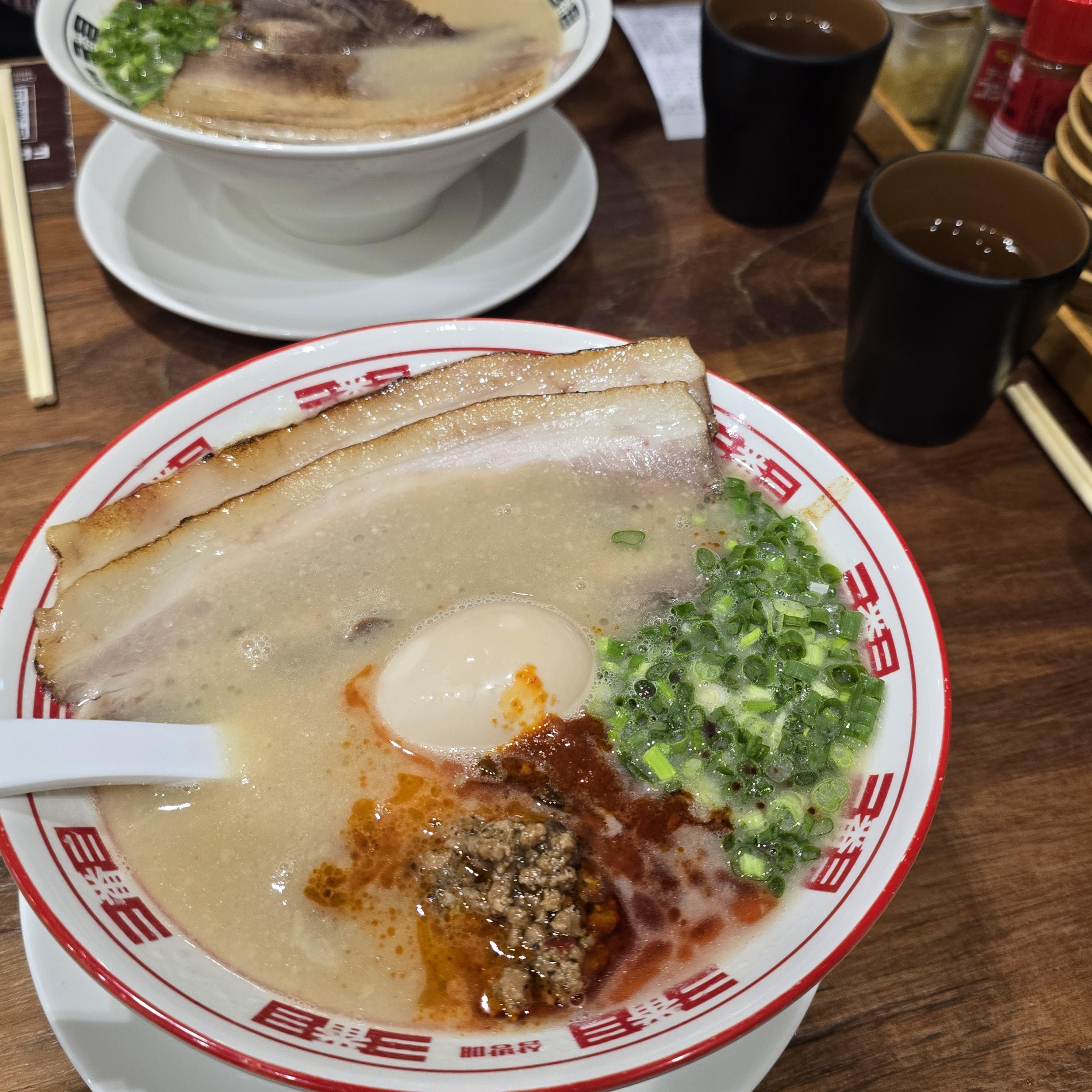 특히, 기본으로 포함된 반숙 계란은 고소한 맛을 더해주어 라멘의 완성도를 높여줬답니다. 개인적으로 마늘과 고춧가루를 조금 넣어 먹으니 더 풍미가 살아났어요.(+ 후추도!) 매운맛을 좋아하시는 분들은 '매운 돈코츠 라멘'을 추천드려요! 매운 고추기름이 살짝 더해져 자극적인 맛을 즐길 수 있답니다.