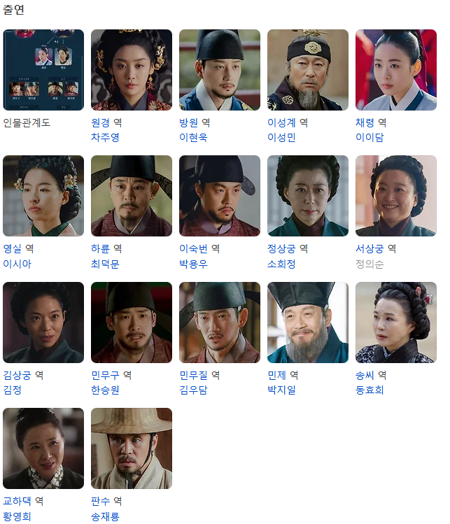 - 출연진: 차주영(원경왕후), 이현욱(태종 이방원), 이성민, 이이담(채령), 이시아(영실) 외