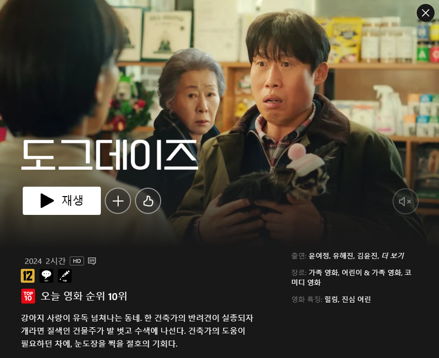 킬링타임으로 딱 좋았습니다. 희로애락이 다 들어 있지만 결국은 웃음과 따뜻함으로 수렴되는 느낌이 좋았거든요. 전문가들 역시 <도그데이즈>가 지닌 장점으로 “다채로운 캐릭터와 배우들의 시너지를 꼽았다”고 해요. 유해진 특유의 친근 코미디와 윤여정의 존재감, 그리고 여러 보석 같은 배우들의 개성 만점 연기는 정말 빼놓을 수 없죠.