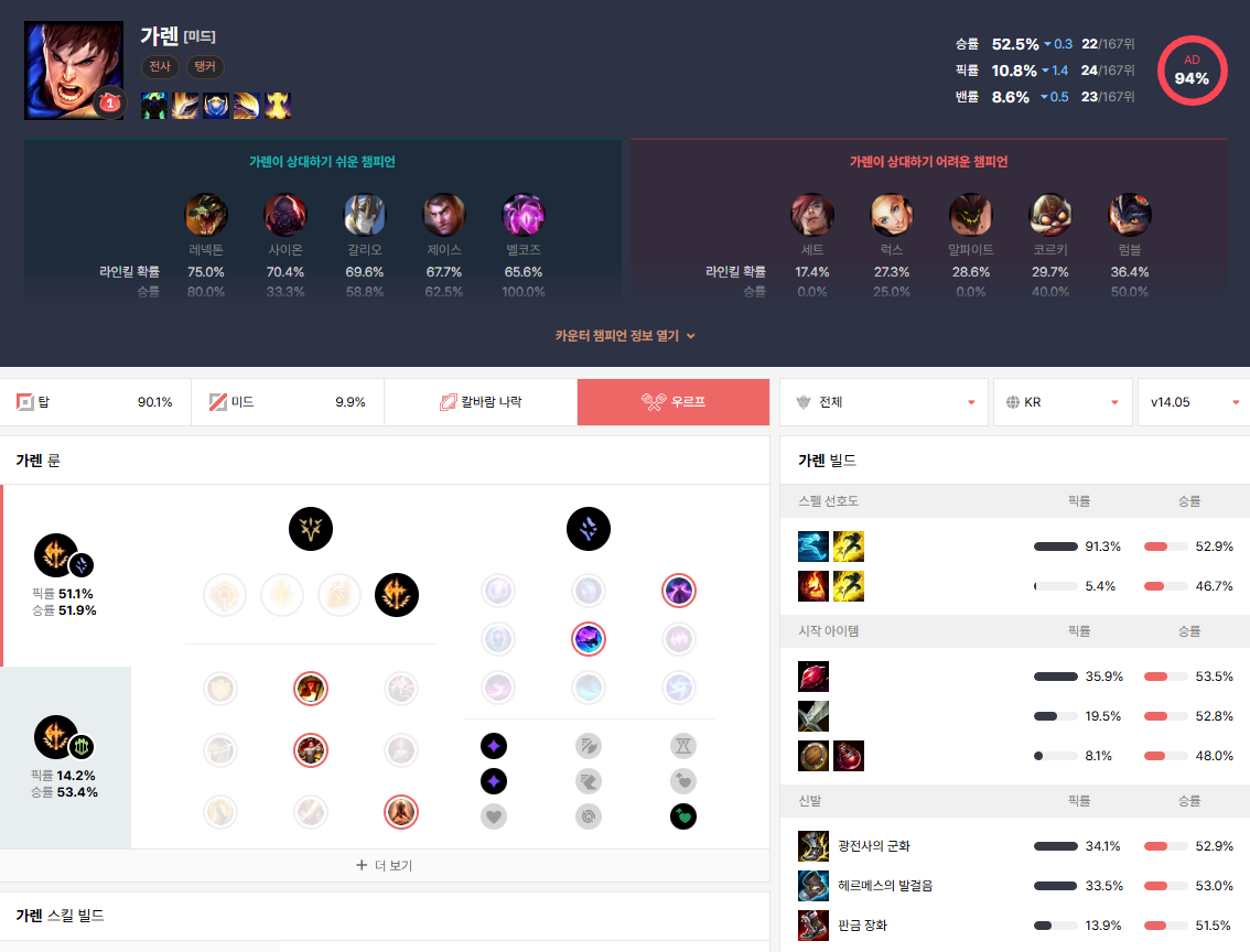 우르프 티어는 opgg 사이트에서 확인 가능합니다! 다양한 아이템 빌드를 조합해보세용ㅎㅎ😁