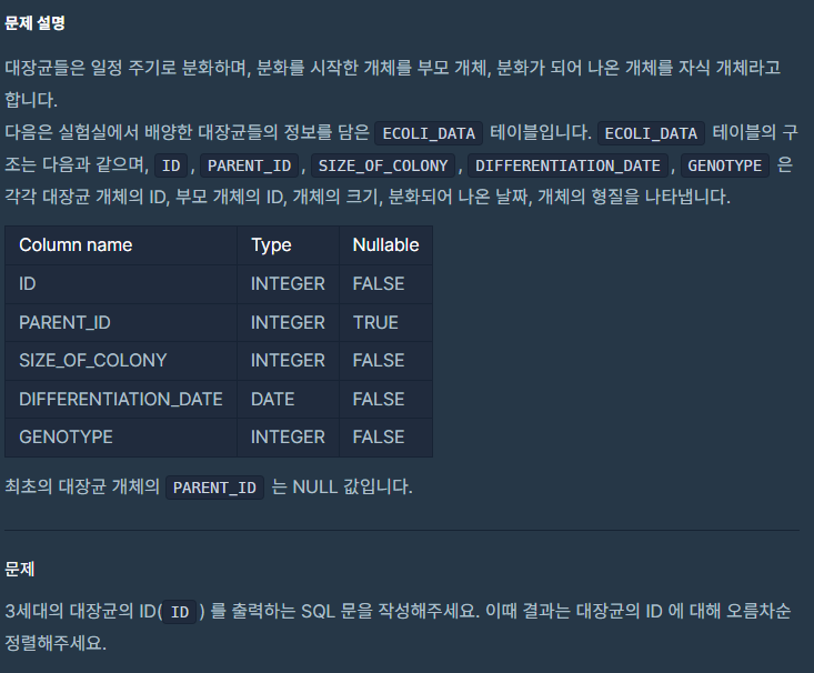 프로그래머스 멸종위기의 대장균 찾기 SQL 코딩 테스트 문제 풀이를 해보자.제출 사이트를 보니 DBMS는 mysql만 지원된다.문제 : 멸종위기의 대장균 찾기https://school.programmers.co.kr/learn/courses/30/lesson