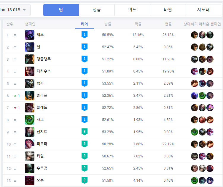 탑 라인은 주로 탱커나 브루저가 활약하는 자리로, 체력이 높고 안정적인 플레이가 가능합니다.