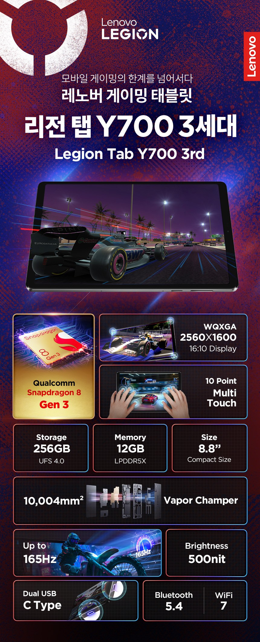 레노버 Y703(리전 Y700 3세대)은 8.8인치 디스플레이와 스냅드래곤 8 Gen 3 프로세서를 탑재한 고성능 안드로이드 태블릿입니다. 이 제품은 게이밍에 최적화된 성능과 더불어 휴대성을 강조한 설계로 주목받고 있는데요, 주요 스펙은 아래와 같습니다: