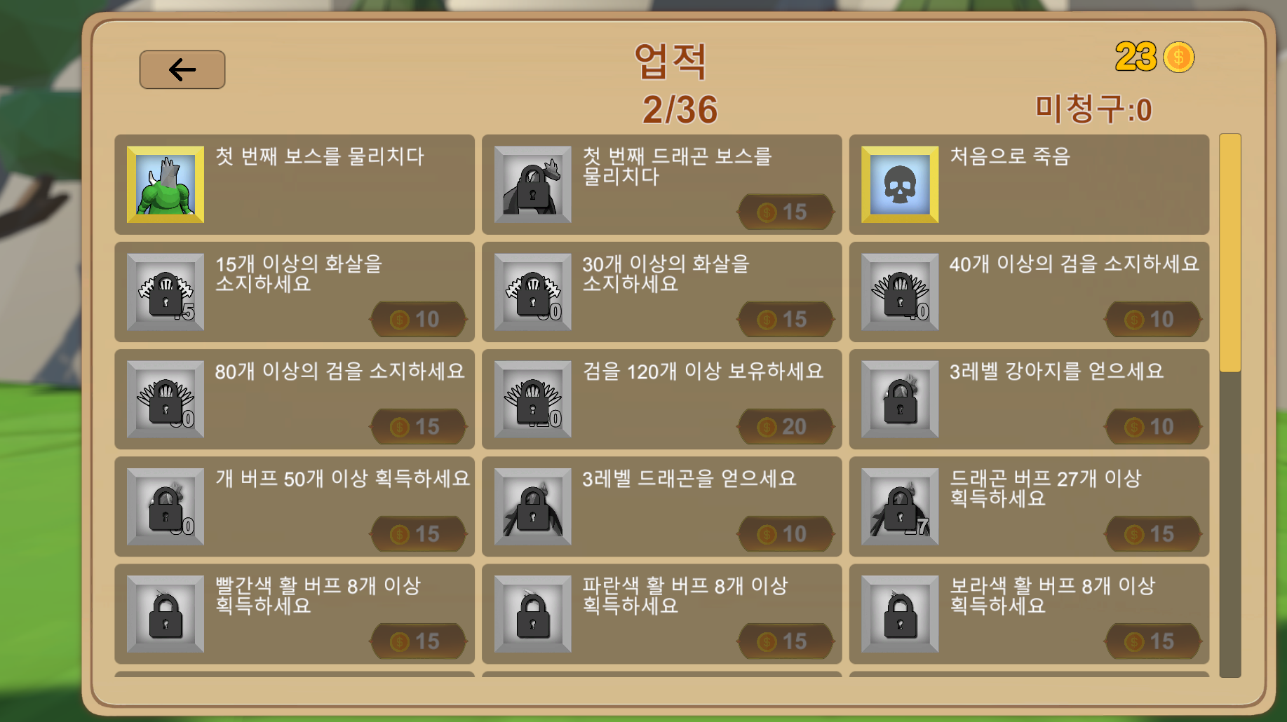 게임 플레이를 수차례 하다보면 업적 퀘스트가 완료되고, 업적 완료 시 금화를 얻을 수 있습니다😏