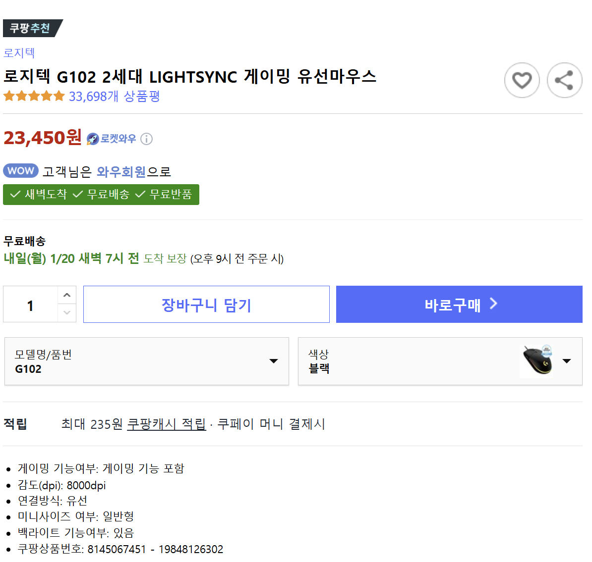 현재 별점 4.8점, 리뷰 33698개를 가진 로지텍 G102 2세대 LIGHTSYNC 게이밍 유선마우스! 지금 쿠팡에서 더 저렴하고 다양한 유선마우스 제품들을 확인해보세요.