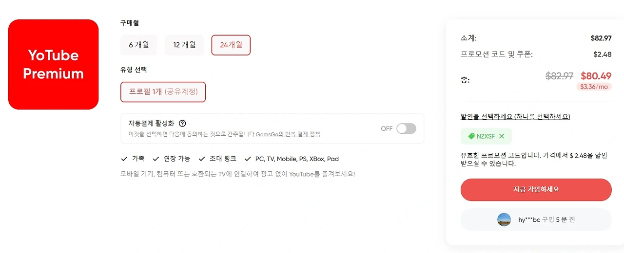 겜스고(GamsGo)는 다양한 디지털 구독 서비스를 저렴하게 이용할 수 있도록 도와주는 플랫폼입니다. 특히 유튜브 프리미엄 같은 인기 서비스도 큰 폭의 할인을 제공하죠. 이번에 소개할 할인코드는 유튜브 프리미엄을 약 70% 이상 저렴하게 사용할 수 있게 해줍니다. 기존 가격 대비 엄청난 절약이 가능한데요..!
