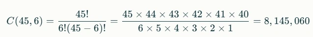 즉, 로또에서 가능한 모든 경우의 수는 8,145,060가지입니다. 🤯