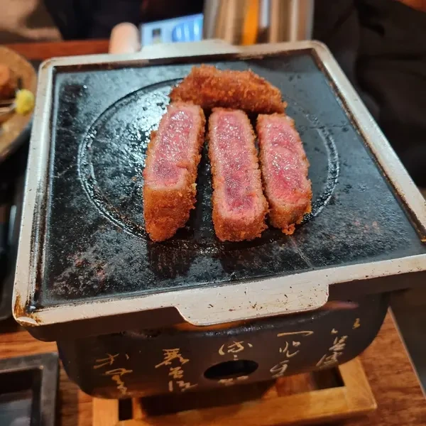 후라토식당의 시그니처 메뉴인 규카츠는 정말 존맛탱 섹시푸드(Who made this?!) 였습니다! 🥩 고기를 개인 화로에 구워 먹는 재미까지 더해져 식사가 더욱 특별했어요. 고기의 육즙과 바삭한 튀김옷의 조화가 일품이었고, 곁들여 나오는 소스도 감칠맛을 더했습니다.