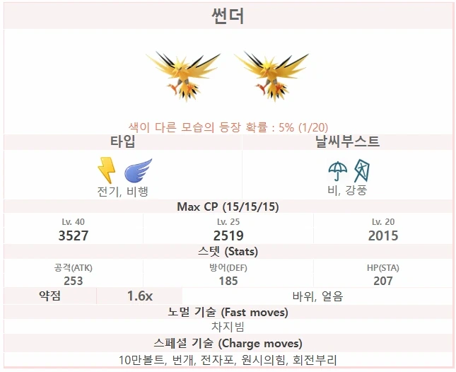 썬더는 전설의 전기/비행 타입 포켓몬으로, 번개 구름 속에서 에너지를 충전하며 강력한 전기 기술을 구사합니다. 레이드와 PVP 모두에서 활용도가 높아 많은 트레이너들이 주목하는 포켓몬입니다.
