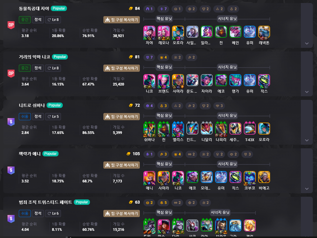 롤토체스 시즌 14 메타에서 검증된 최고의 덱 조합을 소개합니다. 이번 시즌은 다양한 시너지와 전략이 등장해 플레이어들에게 새로운 재미를 선사하고 있는데요, 오늘은 동물특공대 자야, 거리의 악마 니코, 니트로 쉬바나, 그리고 책략가 애니 덱을 완벽히 정리해드릴게요. 초보자부터 숙련자까지 모두에게 유용한 정보가 될 겁니다. 주목하세요! 😎