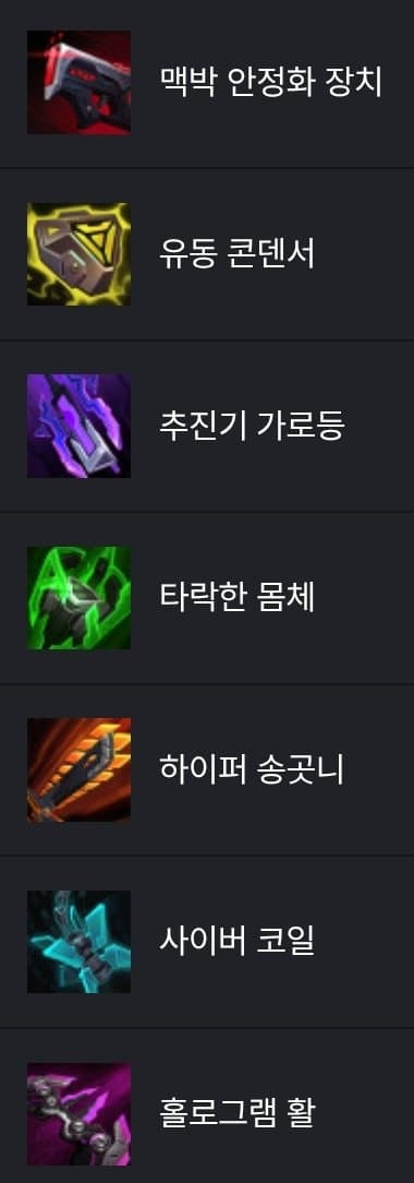 - 1순위 : 맥박 안정화 장치, 유동 콘덴서 (제리 필수템, 둘다 없으면 엑소테크 비추천)