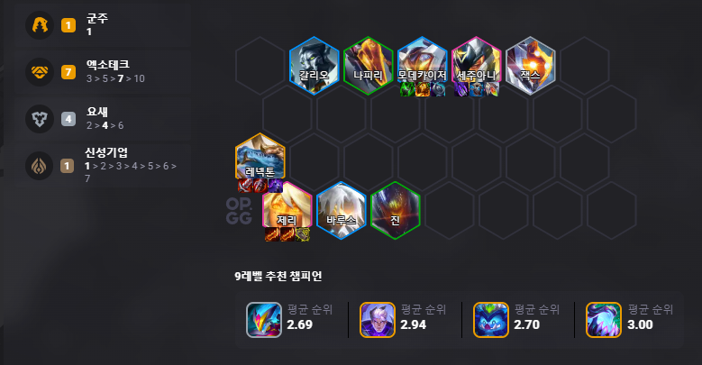 초반 빌드업은 엑소스트 3,5,7렙 베이스에 요새 챔피언 넣어주면 됩니다.(2성 붙은 다른 챔도 가능)