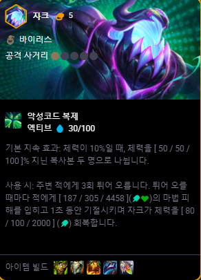 자크는 5코스트로 군중 제어기(cc기)가 있어서 5코스트 마무리 챔피언으로 사용하기 좋습니다. (레넥톤, 가렌, 코부코에 밀리긴 합니다ㅎㅎ)