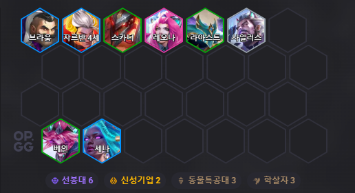 - 일라오이, 사일러스, 베인, 샤코를 활용해 선봉대와 학살자 시너지를 활성화합니다.