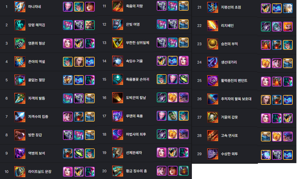 이번 시즌에는 총 29종의 신규 유물이 추가되었으며, 각 유물은 특정 챔피언과 조합 시 엄청난 시너지를 발휘합니다. 위 이미지는 주요 유물의 티어와 효과입니다. 아래 S티어 유물이 누구랑 어울리는지 확인해보세요~