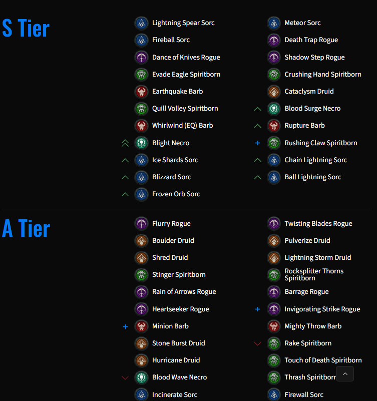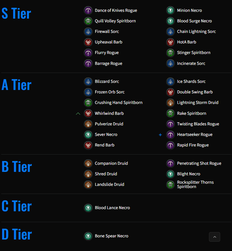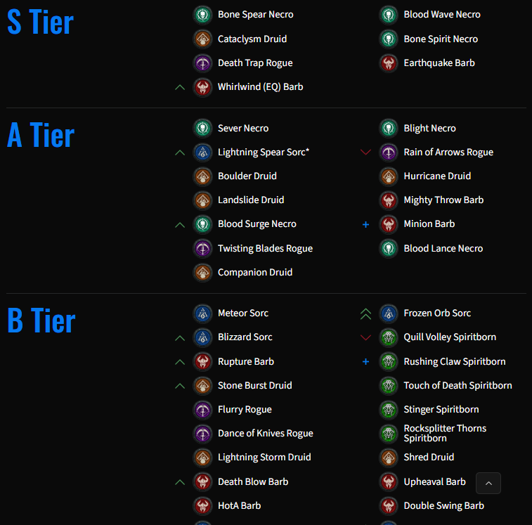 실제로 PTR 기준, 보스 난이도와 드랍율이 조정되면서 강령술사의 뼈창, 피의 파도 빌드와 도적의 죽음의 덫, 화살비, 회전 칼날 빌드가 대세로 떠오르고 있습니다. 드루이드 역시 대격변, 찢어발기기, 싹쓸바람 빌드가 상위권을 유지하고 있네요!