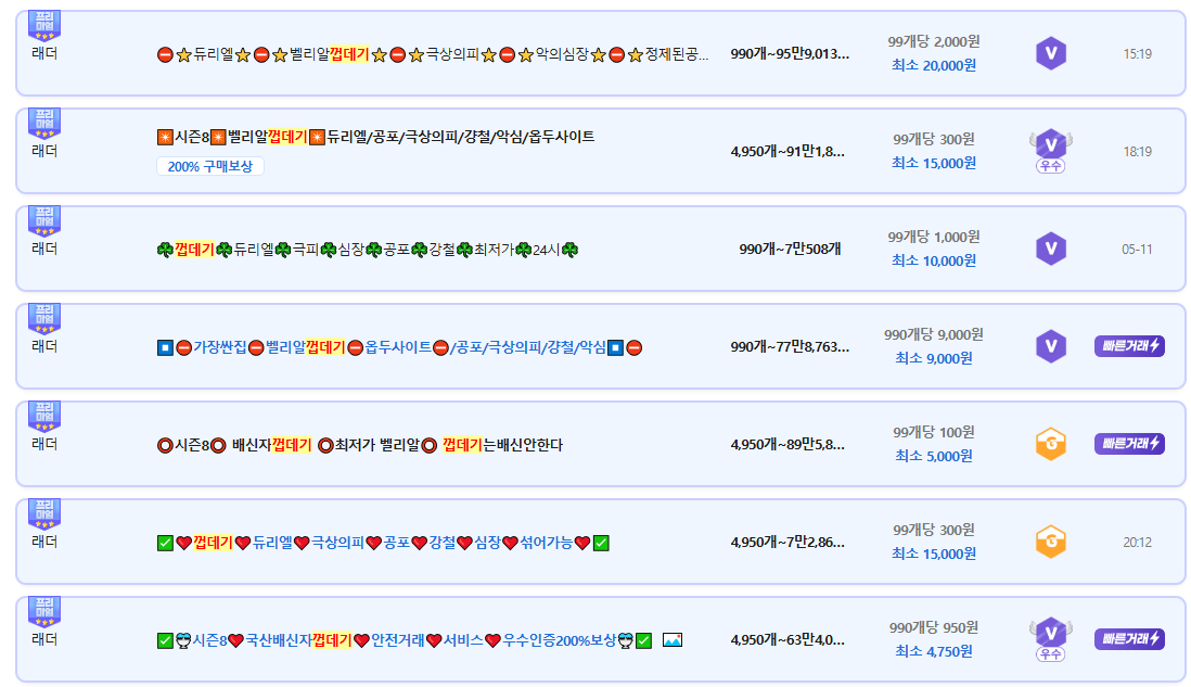 오픈 1주일 차 만에 벨리알껍데기의 가격이 99개당 100원, 1개당 1원 밖에 안하는 상황이 되버렸습니다.