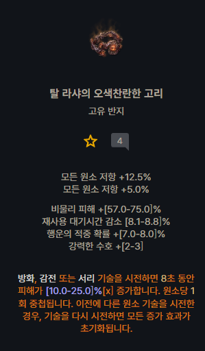 디아2에 탈셋이 있다면 디아블로4에는 탈라샤의 반지(탈라샤의 오색찬란한 고리)라는 직업고유 아이템이 있습니다!