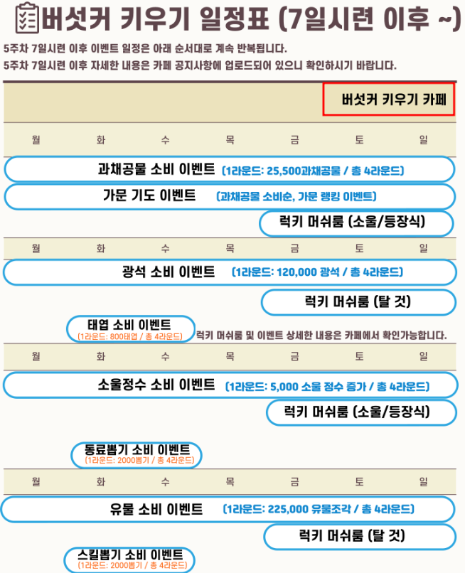 버섯커 키우기는 위 이벤트 일정이 계속 반복됩니다. 따라서 평소에 재화를 모아놓고 이벤트 타이밍에 맞춰서 몰빵하시는게 중요합니다. 예를들면, 태엽소비 이벤트 때 3200태엽을 쓰게되면 이벤트 상품으로 망치 8000개를 받습니다. 개꿀팁!!