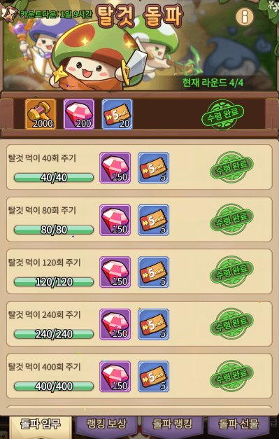 다이아는 조금씩 아껴서 무조건 무한의 태엽을 구매하세요. 버섯커키우기에는 5주차마다 반복되는 돌파 이벤트가 있는데요.