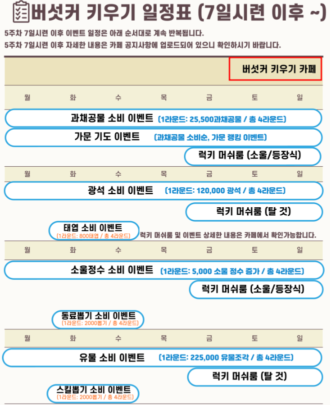 럭키 머쉬룸은 매주 금토일에 진행됩니다. 빨간소울은 머쉬룸 외에도 수급처가 많으니 소울 주차때는 잠깐 쉬어가는 것도 좋습니다😀