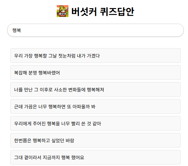 예를들면, 행복으로 검색을 하면.. 아래와 같은 답안이 나옵니다!🤩