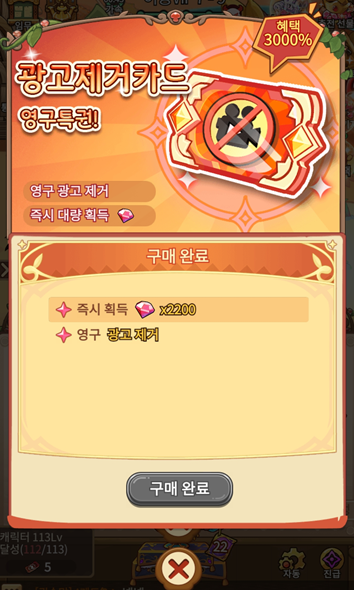 버섯커키우기 광고제거 평생권은 약 12,000원 정도에 판매되고 있습니다. 이걸 한 번만 결제하면 앞으로 영원히 광고를 볼 필요가 없습니다. 월정액이 아니라 '평생'이라는 점이 엄청난 메리트죠. 광고제거권을 구매하면 아래와 같은 혜택이 따라옵니다.