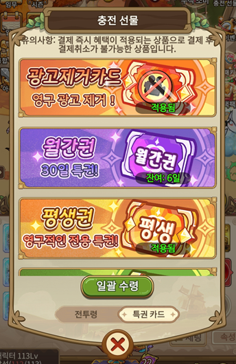 버섯커키우기에 메뉴 - 충전 선물 - 특권 카드로 들어가시면 여러가지 구독형 서비스들이 있습니다. 이중에 광고제거카드와 평생권은 한번 구매하면 영구적으로 이용가능한 서비스인데요! 여기서 평생권과 광고제거카드에 대해 알아보겠습니다.