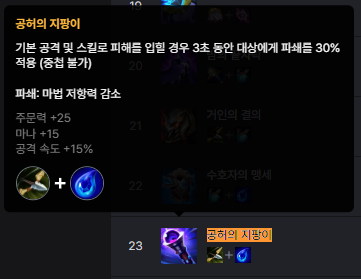 공허의 지팡이 하나만으로 적의 마저를 30%나 깎아버리니, 마법 딜러가 있는 조합이라면 무조건 만들어야 합니다.