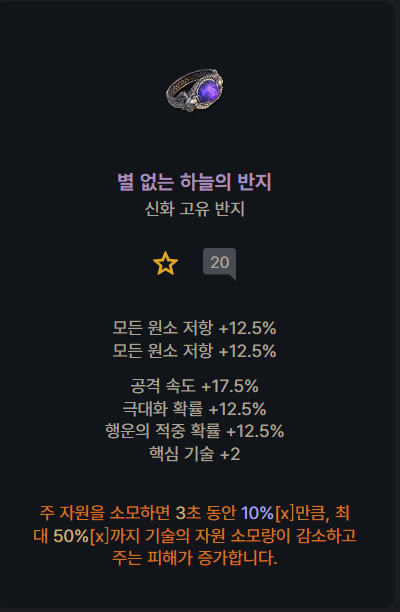 "별 없는 하늘의 반지(Ring of Starless Skies)"는 디아블로4 시즌5부터 등장한 신화 고유(우버 유니크) 반지입니다. 이 반지는 극한의 희귀도를 자랑하며, 강력한 옵션 덕분에 거의 모든 직업에서 각광받는 아이템입니다.