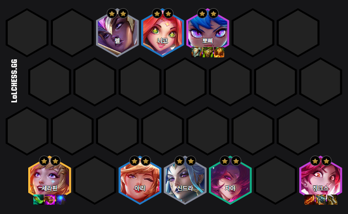 | 추천 배치법 | 앞열: 뽀삐·렐·니코 / 중후열: 자야·세라핀·아리 / 후방: 징크스·신드라 |