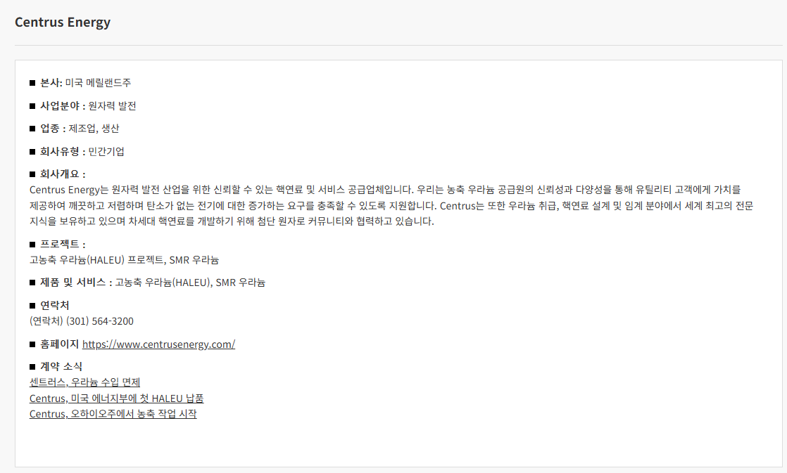 | 주요 사업 | 우라늄 농축 및 공급, 특히 HALEU 상업 생산 능력 보유 |