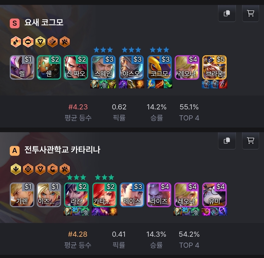 요새 코그모는 3코스트인 코그모와 야스오를 3성작하는 리롤 덱입니다. 보통 7레벨에 50골드를 유지하면서 천천히 리롤을 돌려 핵심 기물들의 3성작을 노리는 것이 일반적이에요. 6요새 시너지를 완성하는 순간 앞라인이 절대 뚫리지 않는 경험을 하시게 될 겁니다!