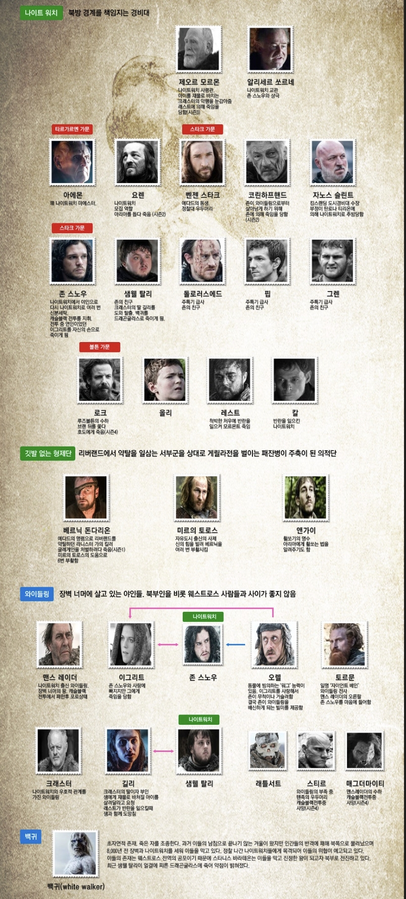 - 존 스노우: 에다드의 서자. 출생의 비밀을 간직한 채 장벽의 나이트 워치로 들어가게 됩니다.