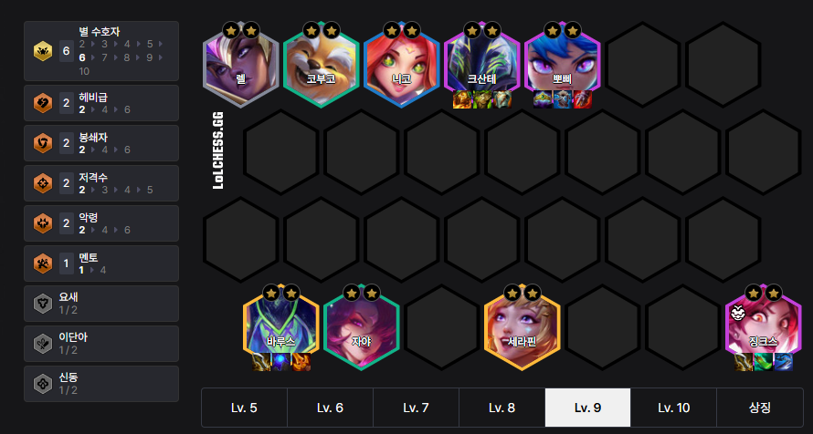 8레벨에 도착했다면, 바닥까지 리롤해서라도 징크스 2성을 찾아야 합니다. 징크스 2성과 앞라인 탱커들이 2성작이 어느 정도 완료되면 덱이 매우 강력해집니다. 이후에는 50골드를 유지하며 천천히 징크스 3성을 찾거나, 여유가 된다면 9레벨로 가서 세라핀, 크산테 등 고코스트 기물을 추가해 덱을 완성합니다.