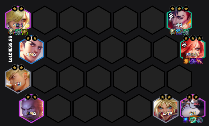 - 조합 유닛: 레오나, 제이스, 가렌, 라칸(3성), 카타리나(3성), 라이즈, 이즈리얼, 유미