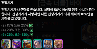 - 바이 3성작 완료 후: 7레벨로 넘어가 6전쟁기계 시너지를 완성합니다.