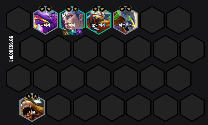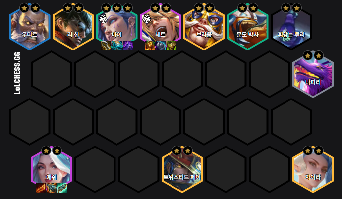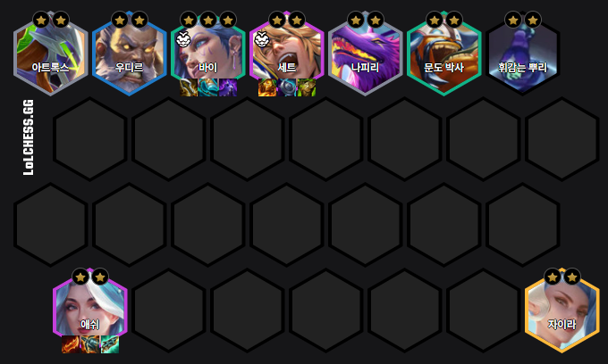 모든 과정을 거쳐 완성된 8레벨 기준 최종 조합 예시입니다. 배치를 통해 바이와 애쉬가 안정적으로 딜을 넣을 수 있도록 보호하는 것이 중요합니다.