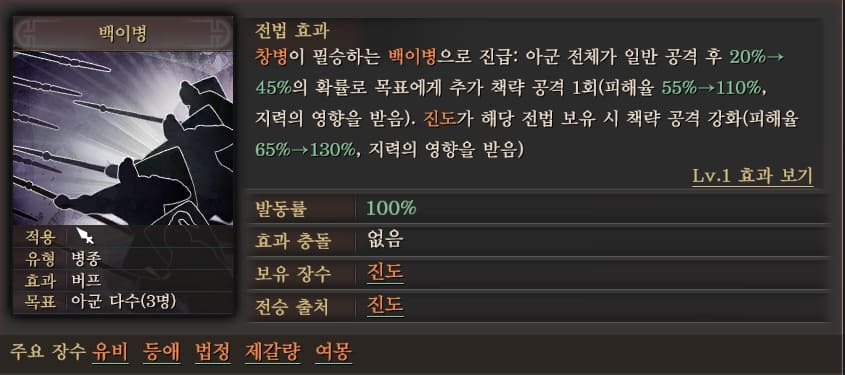 유비 : 팔문금쇄진(조인 전승) / 백이병(진도 전승)