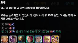 - 3-2 (6레벨): 핵심 타이밍! 6레벨을 찍고 50골드 이상을 유지하며 쉔, 신 짜오, 자야를 찾기 시작합니다. 이자를 깨지 않는 선에서 천천히 리롤해주세요.
