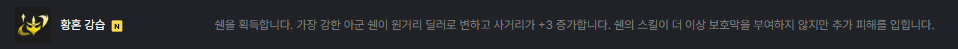 | 딜러: 쉔 | 구인수의 격노검, 마법공학 총검, 거인 학살자 | 피바라기, 명멸검(유물), 데마시아의 왕관 |