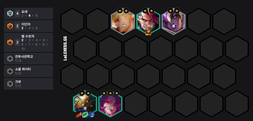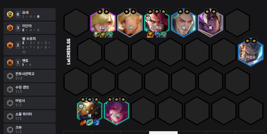 - 탱커 라인: 레오나, 가렌, 신 짜오 (3성), 스웨인, 렐
