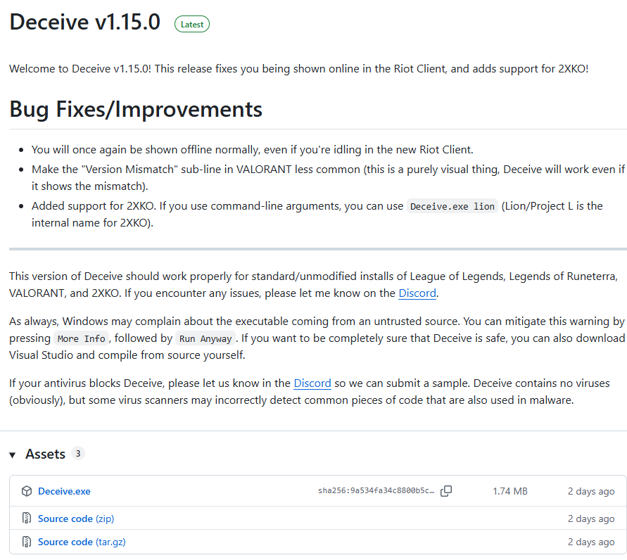 The program I'm introducing today is called 'Deceive'. It's a handy tool that slightly alters how you connect to Riot Games' chat servers, making you appear offline to your friends list. Many users have been using it for years, and since it doesn't affect gameplay at all, it's known to be a relatively safe method.