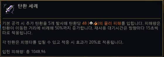 | 재충전 (ReEnergize) | 충전 공격이 빗나가면 중첩 미소모. 완충 시 다음 평타가 대상 현재 체력 10% 추가 마법 피해. | 공격 강화, 충전 |
