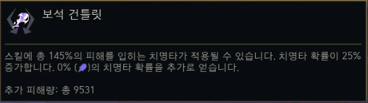 | 보석 박힌 건틀릿 (Jeweled Gauntlet) | 스킬 공격이 치명타 가능 (145% + 추가 피해). 치명타 확률 +25% (+ 주문력 100당 4.5%). | 주문 치명타 |