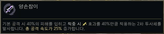 | 이도류 (Dual Wield) | 총 공속 +25%. 두 번째 공격마다 투사체 발사 (피해 40%, 적중 시 효과 40%). | 공격 강화, 적중 시 효과 |